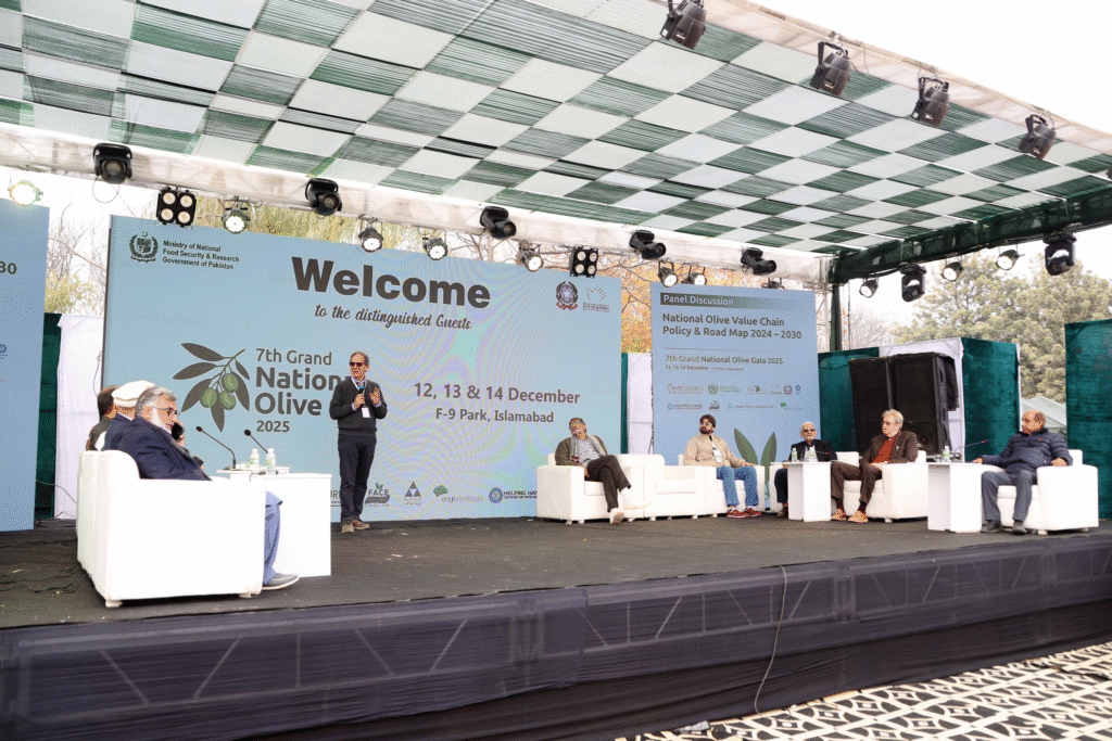 A key highlight of the event was the panel discussion on “National Olive Value Chain Policy & Road Map 2024–2030”, outlining the strategic direction for policy harmonization, quality standards, and climate-resilient growth. The policy framework, developed in consultation with national and international experts, is currently under approval by the Government of Pakistan and is expected to serve as a comprehensive roadmap to strengthen the olive value chain and enhance export potential. Mr. Giuliano Ramat from the Italian Agency for Development Cooperation (AICS) highlighted the importance of institutional collaboration in ensuring policy implementation and long-term sectoral development.